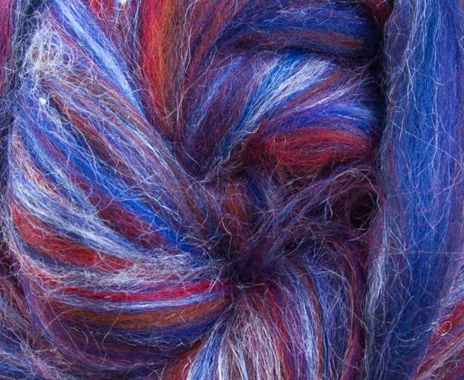 A combination of dyed 23 micron merino wool tops (70%) and extra bleached tussah silk (30%) to create a rainbow blend with a silky sheen. Perfect for hand felting, hand spinning and many other craft uses.