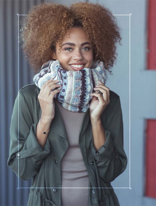 • Relax and chill out with mellow mitts, a textured bag, and a captivating wrap.
