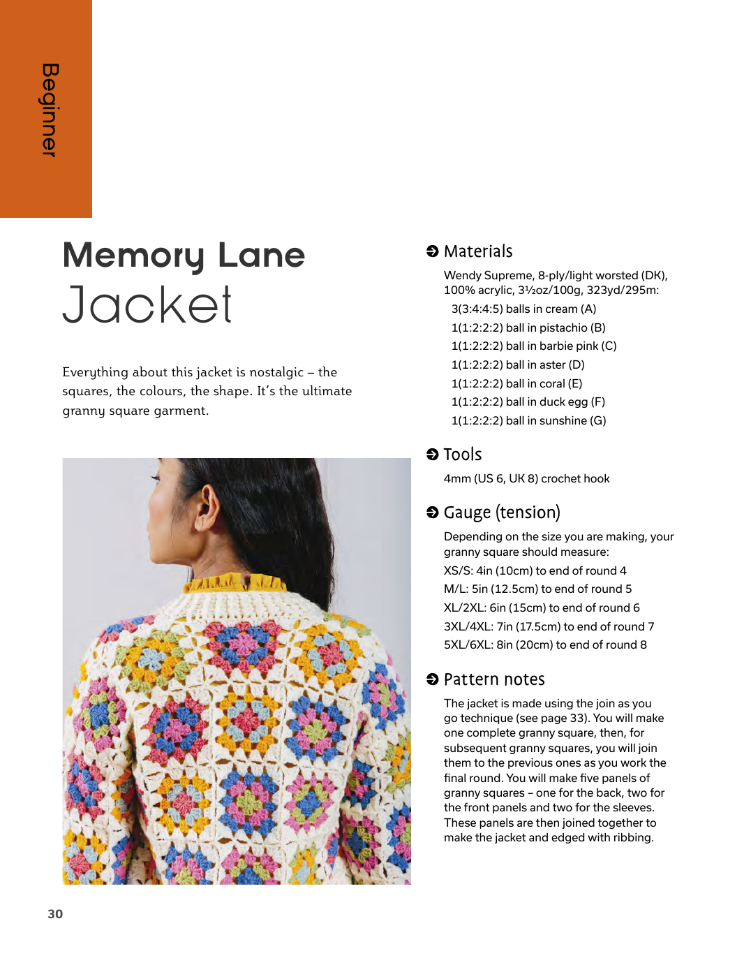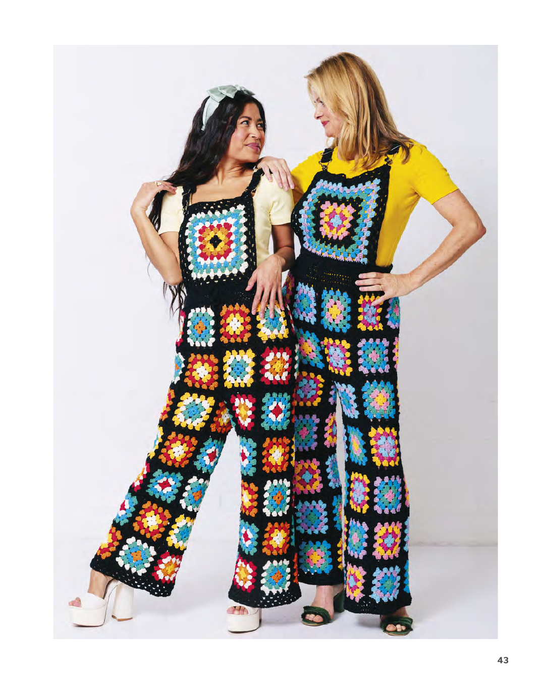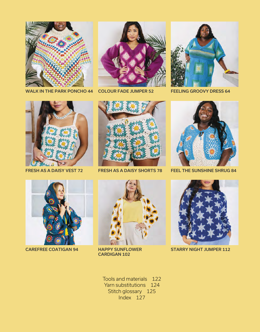 From snuggly statement cardigans and jumpers to festival-worthy shorts, dungarees and a bag, each project features a different granny design, including traditional granny squares, granny stripes, hexies, solid granny squares and granny circles. Each project gives you clear guidance on sizing and helps you calculate the number of granny squares you need. There are clear, beginner-friendly instructions given with step-by-step photos, charts and written patterns, along with simple construction diagrams to help you piece together and finish your garments with ease.