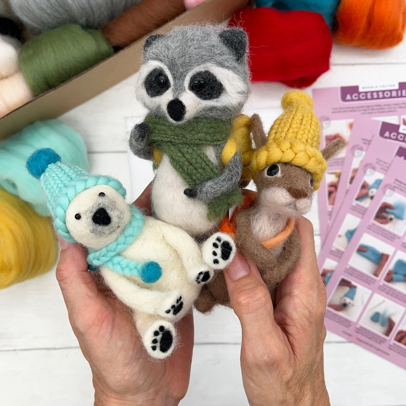 Biggest bumper kit yet! This needle felting hobby set is packed full of high-quality, cruelty-free natural wool, felting needles, eye pins, felting mat, armature wires and instructions to make three cute creatures wrapped up for winter.