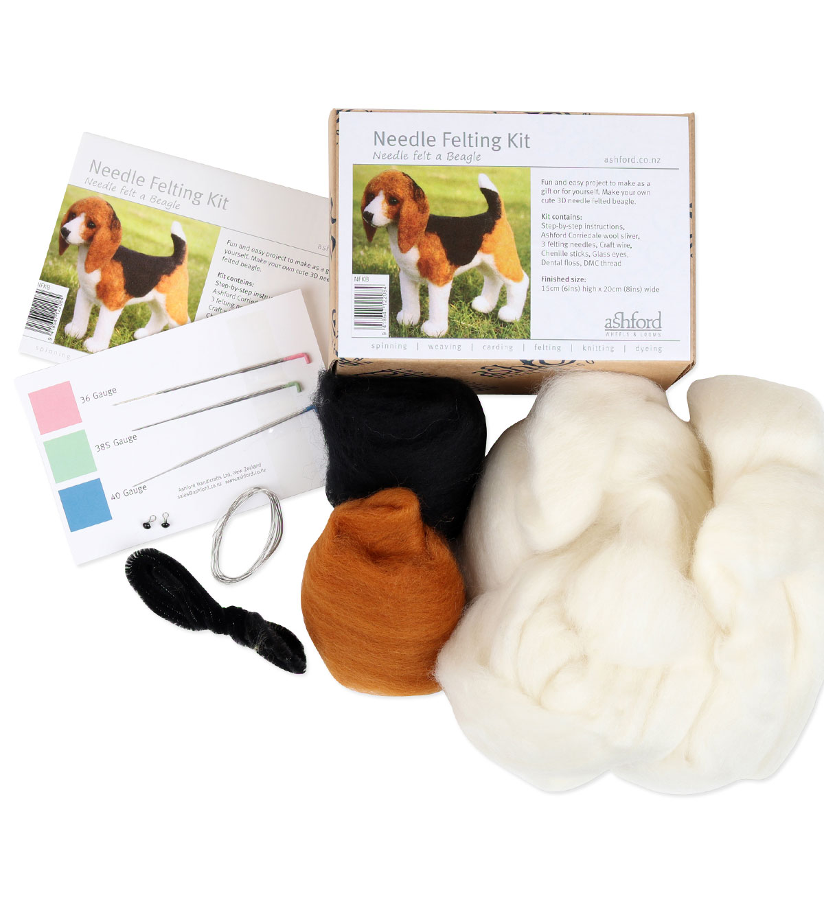 Ashford Corriedale wool sliver, 3 felting needles, craft wire, pipe cleaners, glass eyes – 4mm, dental floss, DMC thread.