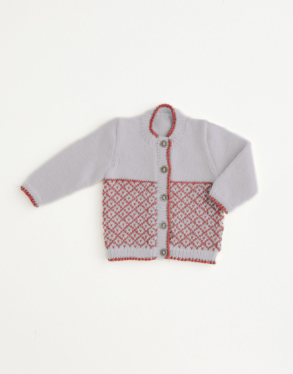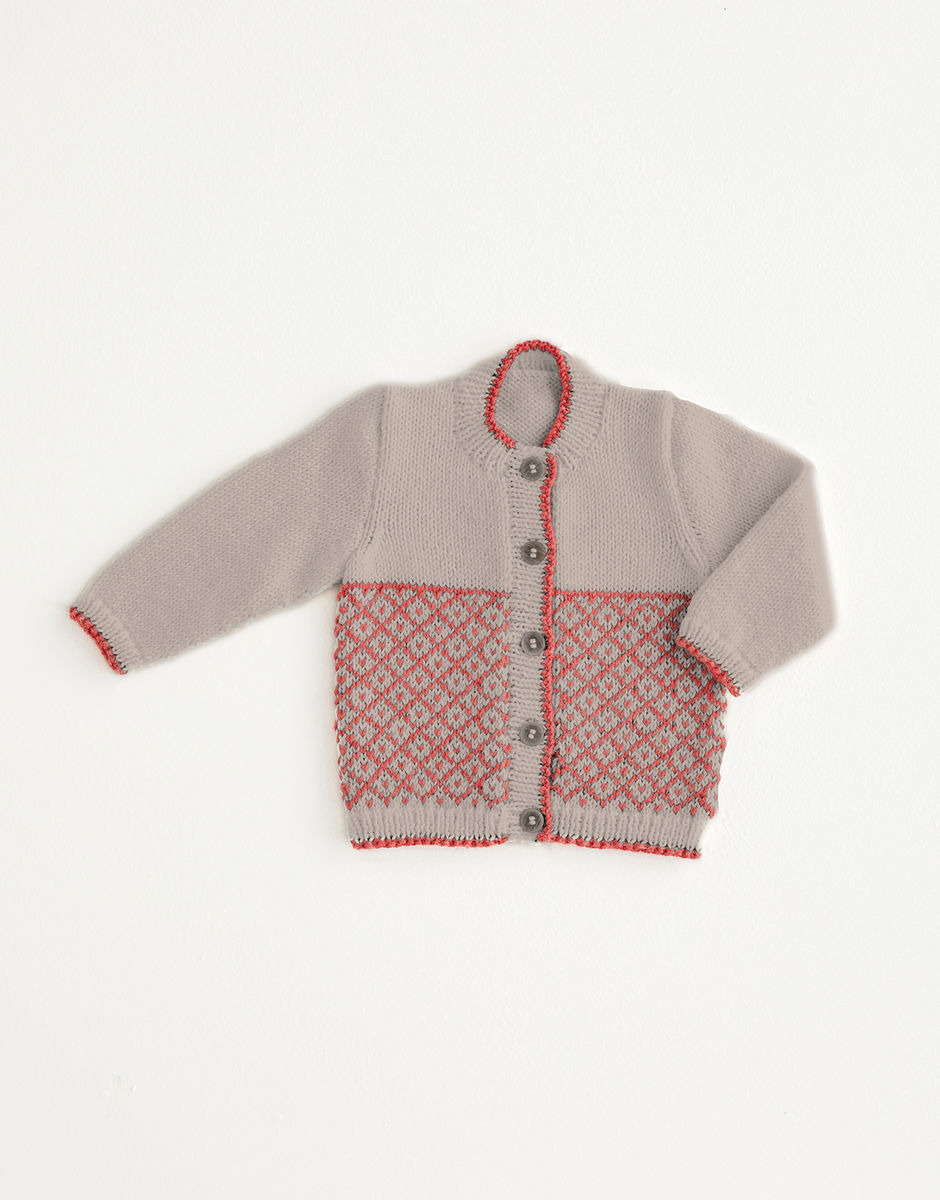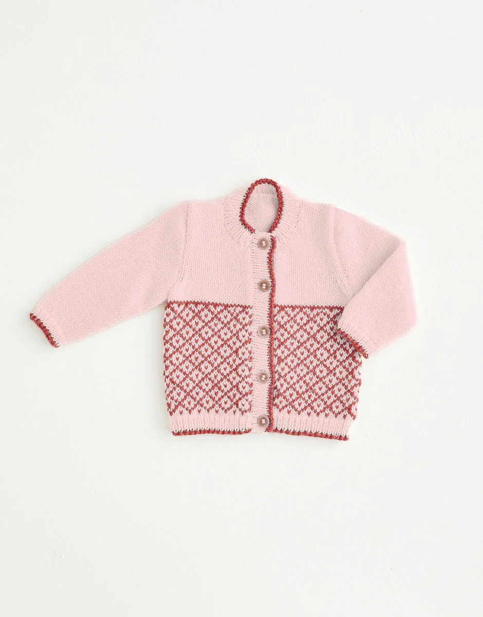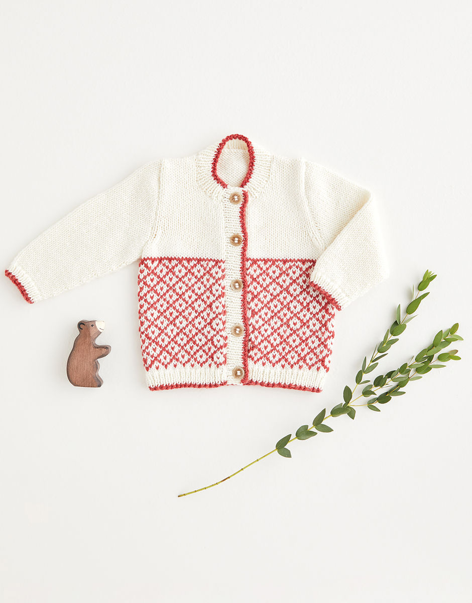 Take your baby on a Nordic adventure with our fair isle cardigan in Snuggly Cashmere Merino Silk. Featuring colour-work inspired by the red roofs common to Scandinavia and a contrast trim to the rib which creates a cute piping effect.