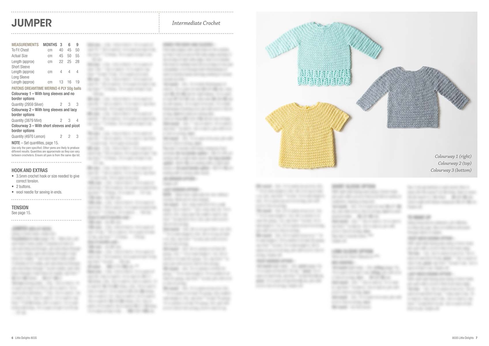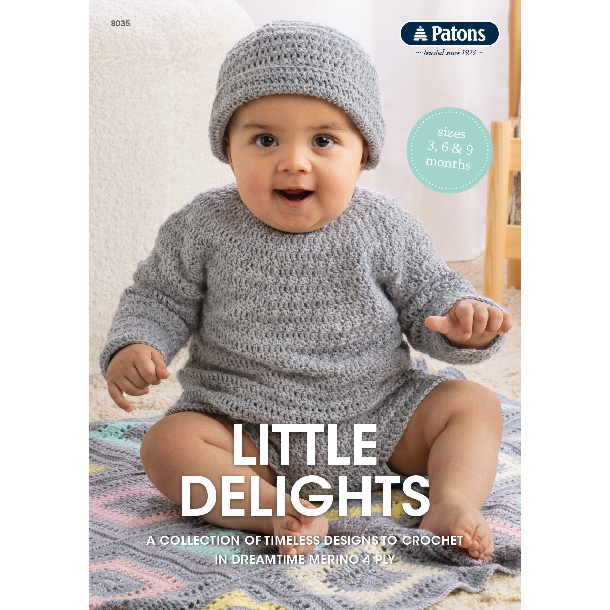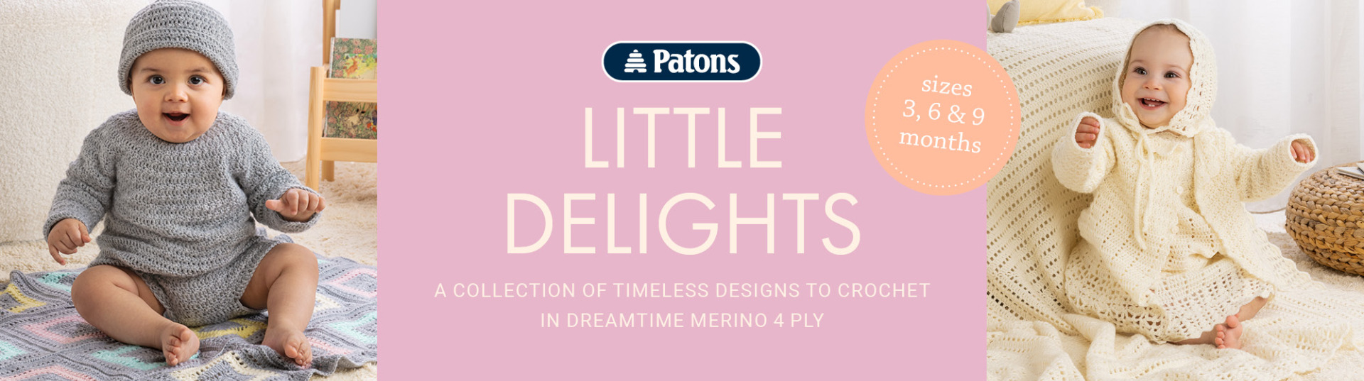 A collection of timeless designs to crochet with edging options in Patons Dreamtime Merino 4 ply. Sizes 3, 6 and 9 months