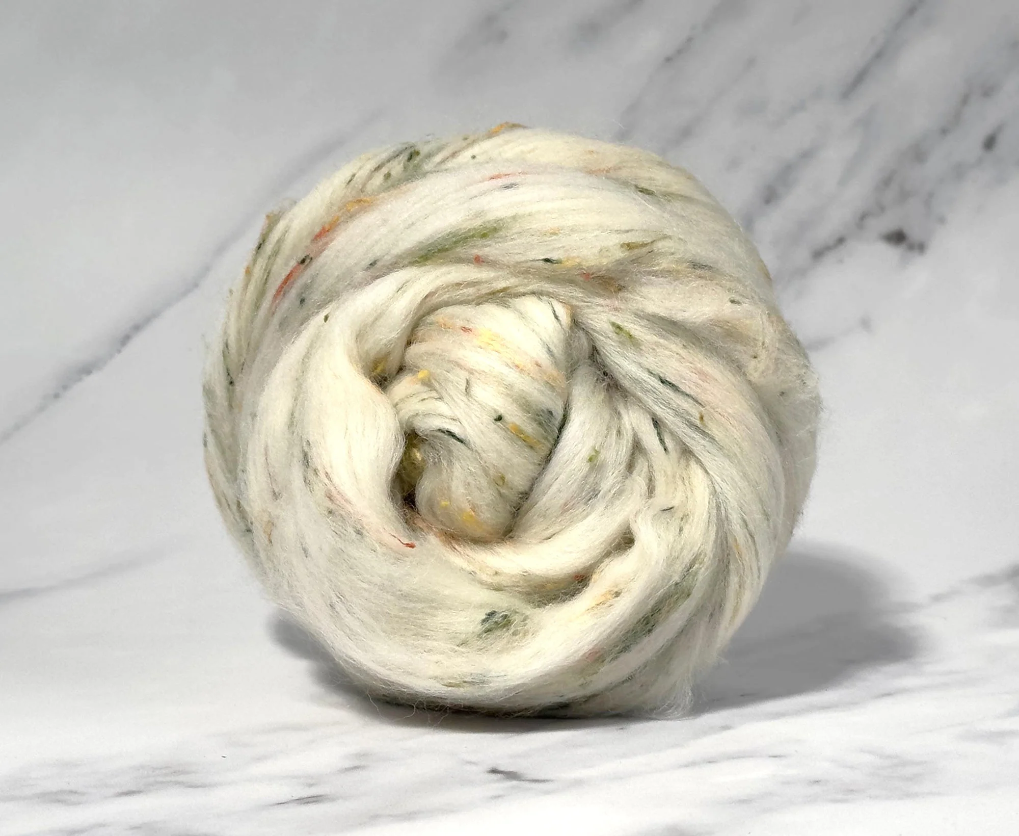 A creamy base of Polwarth Wool infused with fruity colours of viscose nepps. Ideal for most fibre crafts including spinning, felting, weaving & more.