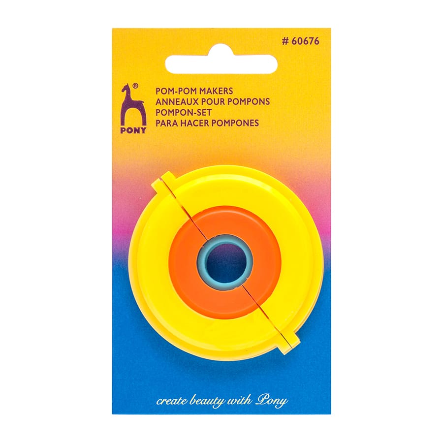 Pony Pom Pom Maker is a set of three pairs of different size rings. Wind the yarn around the rings, then trim to create furry decorative balls. These pom poms could be used to decorate children’s garments or for making soft toys. Children would find it easy to use. (Supervise any small parts with young children). The Pom Pom maker is made of colourful plastic.