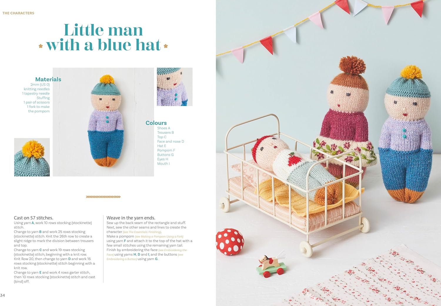The author has developed a clever technique whereby the toys are knitted flat in a rectangle shape and then stitched into a tube shape before being stuffed and closed. Any embroidery details on the clothes are added at this point.