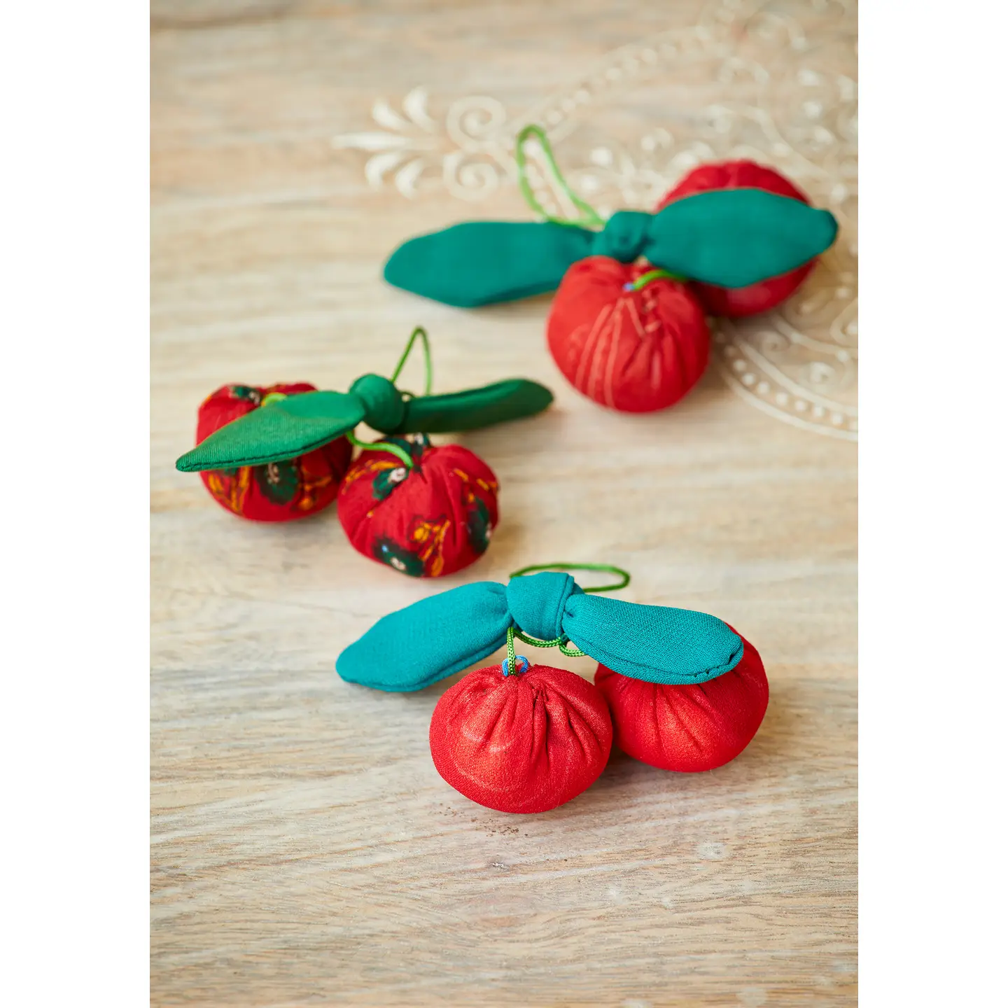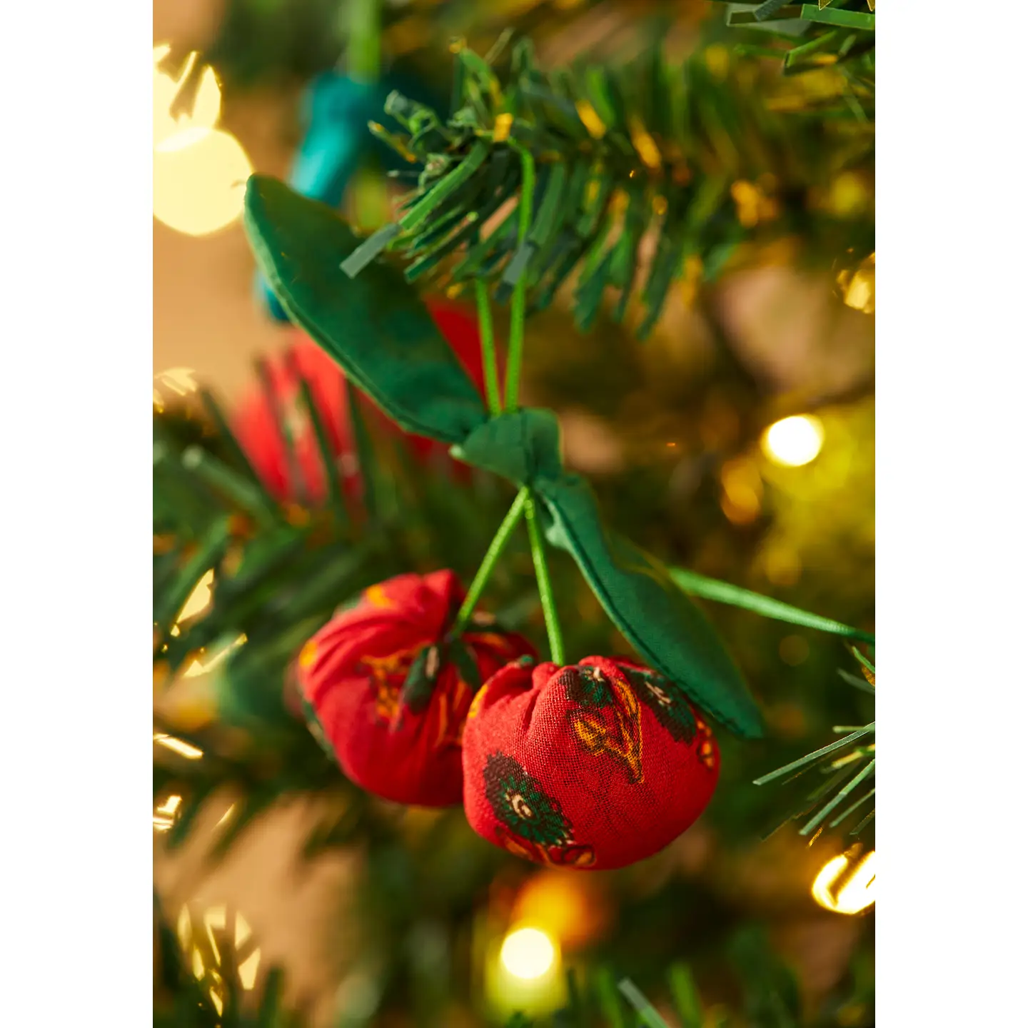 Two deliciously red cherries hang from a jointed stem, crowned by two green leaves. This fun eco decoration has a fabric cord attached for mounting.