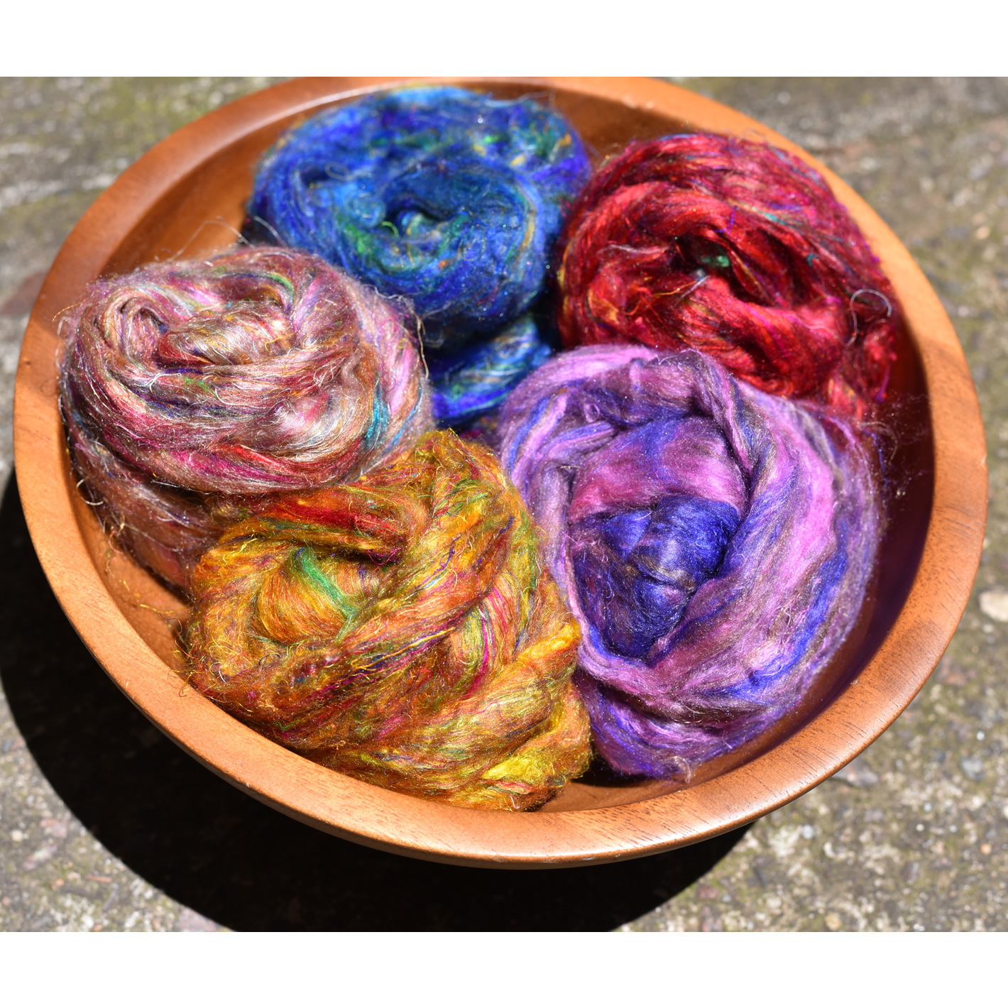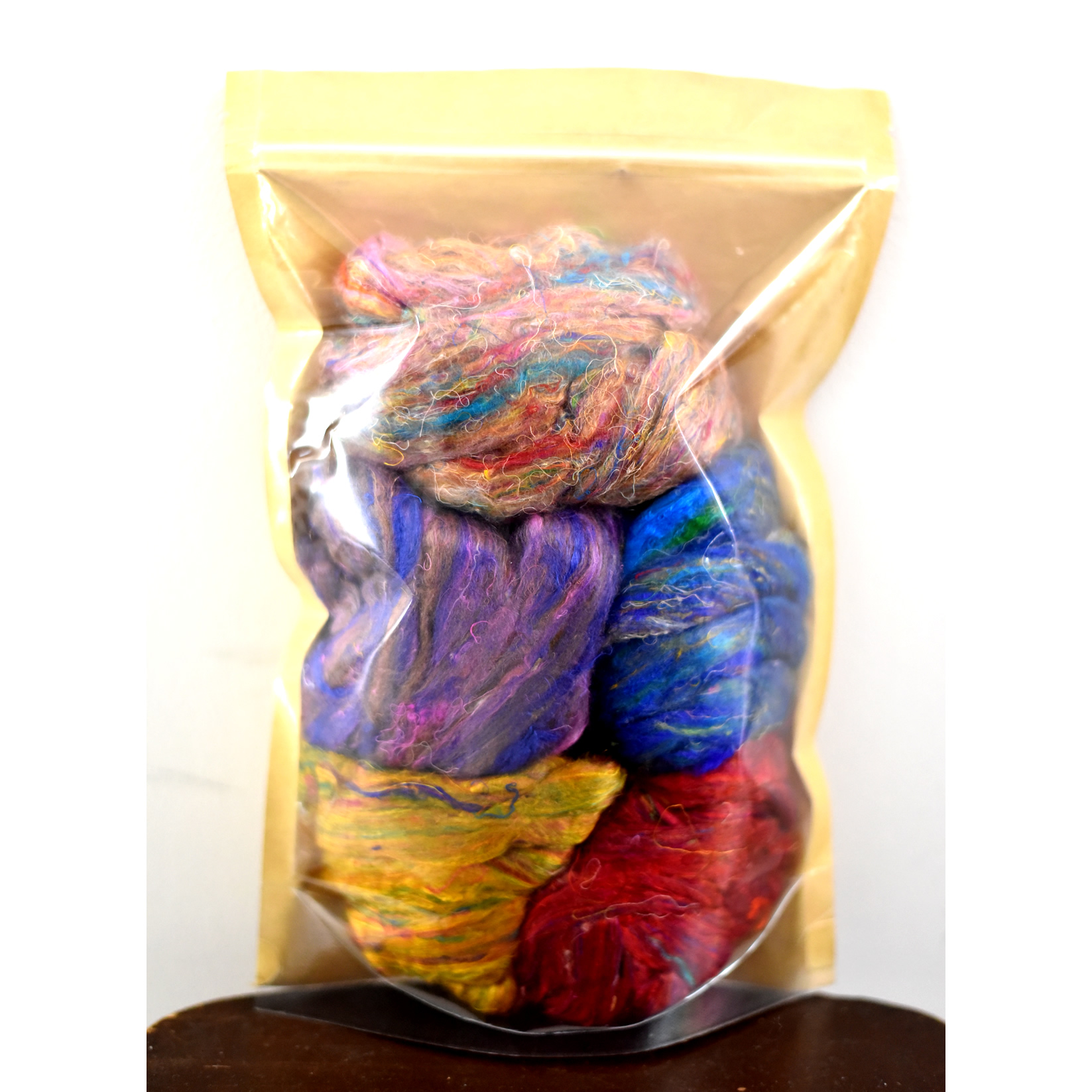 Beautiful Sari Silk combinations created using a blend of bold silks, perfect for spinning wet felting, blending with wool and more.