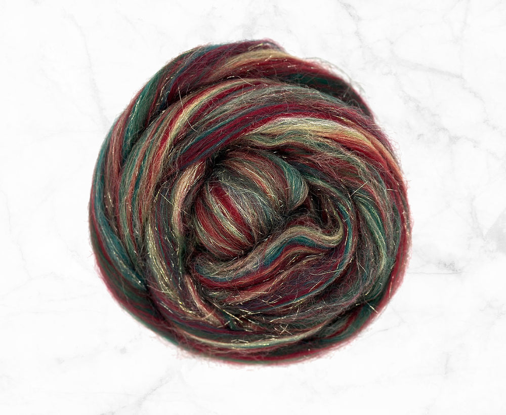 aaah…Traditional Christmas colours wrapped up in a squishy bundle of wool! We’ve blended deep greens, red and added a touch of gold to this festive fibre.