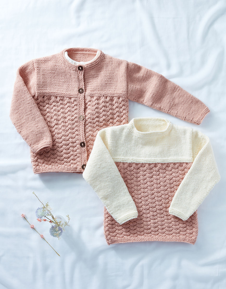 An adorable sweater and cardigan in Supersoft Aran. The lovely cable patterning, garter stitch trims and the option of a contrast yoke make this design a favourite to knit again and again as your children grow.