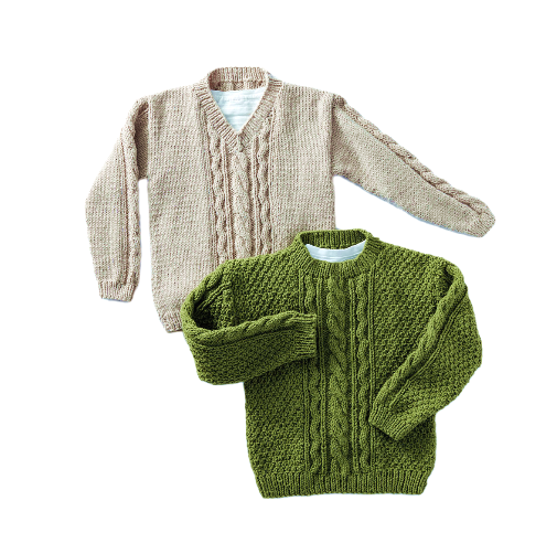 These beautifully finished V-neck and round-neck sweaters are perfect for kids of all ages. Featuring cable details and the option of stocking stitch or moss stitch, these sweaters are made in Super soft Aran yarn.