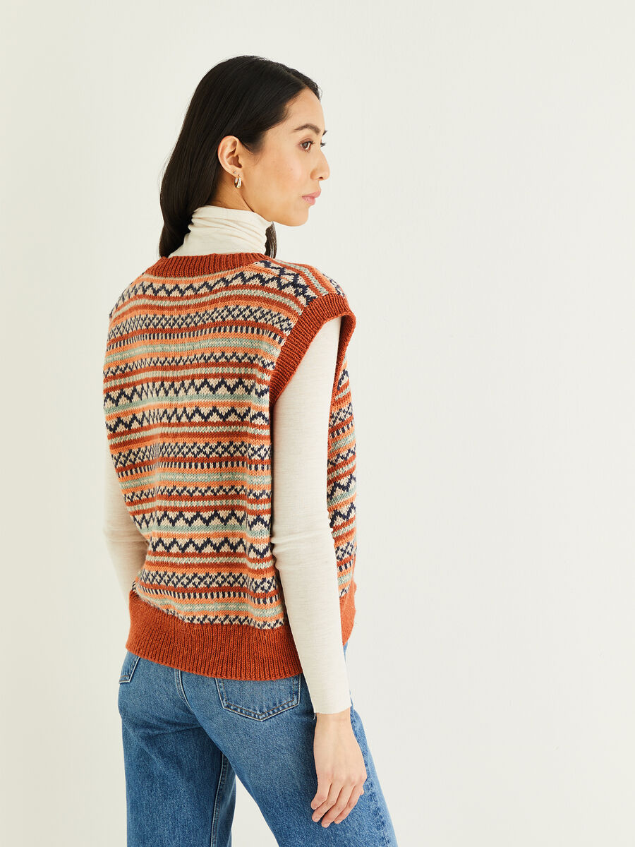 The modern Fair Isle patterned stripes in this relaxed fit vest make for a satisfying knit. Although it might look intricate, our designers have used only two shades of yarn in any row, so it’s not quite as tricky as it appears. Wear with a plain top to show off your knitting skills or a patterned blouse in similar shades for a sophisticated way to work the vest trend.