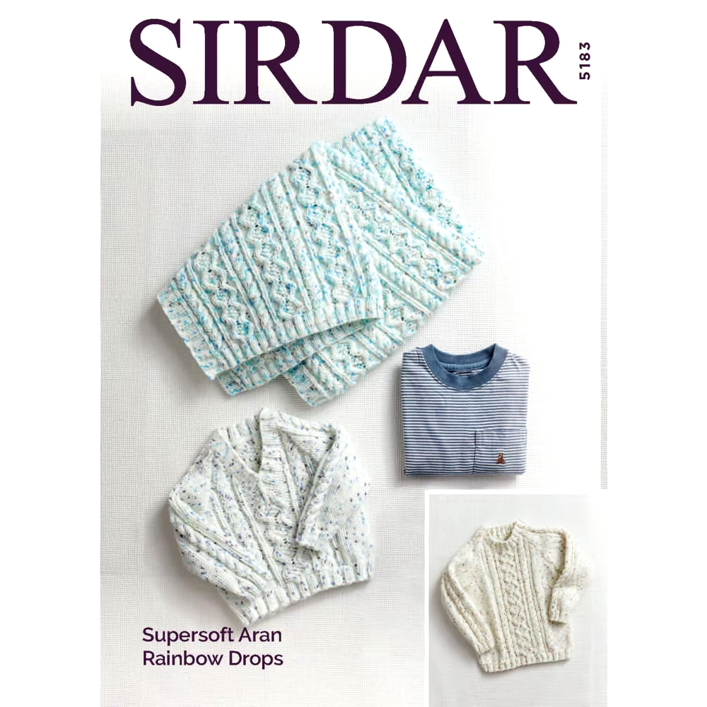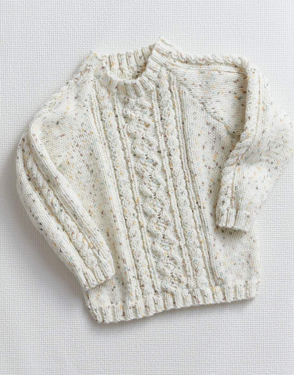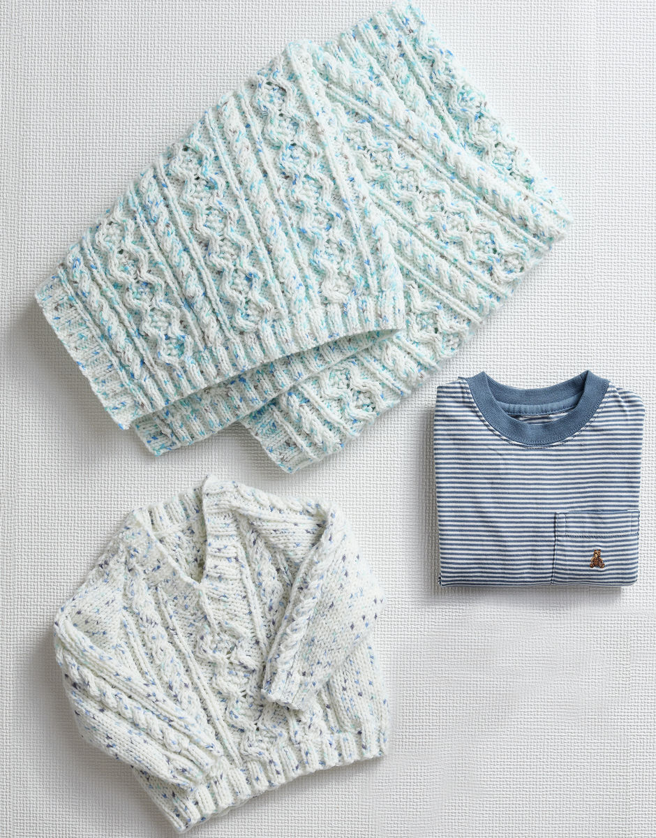 Co-ordinating sweater and blanket in cable stitch knitted in our cute colour effect yarn for little ones up to 7 years.