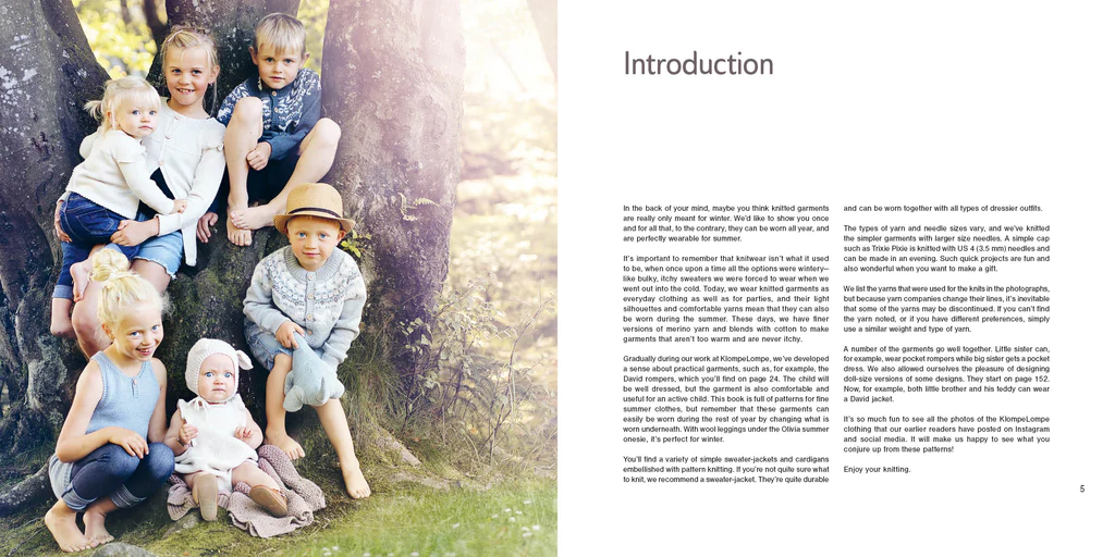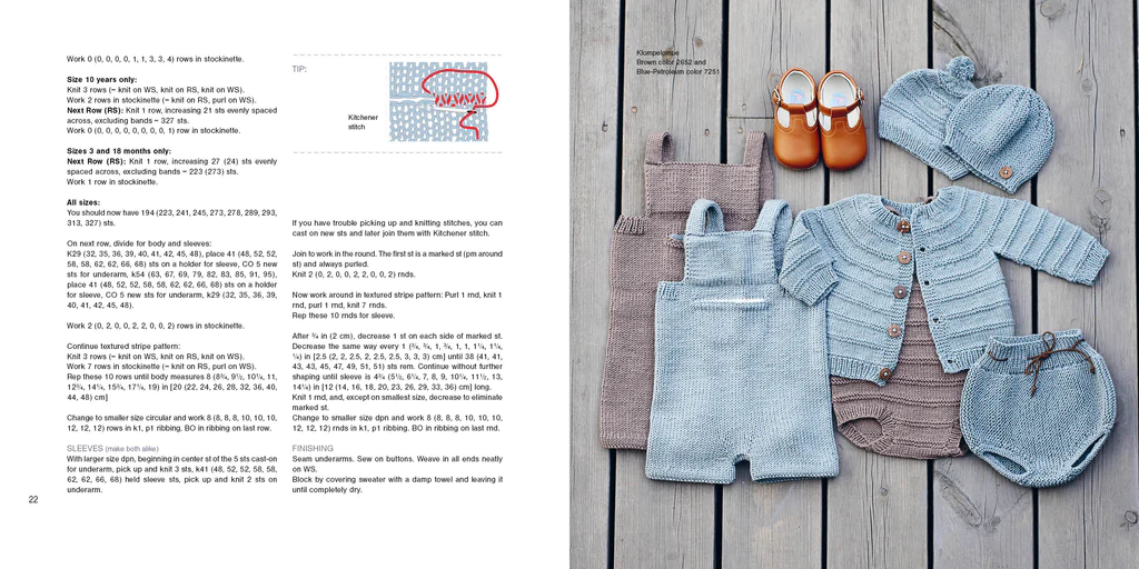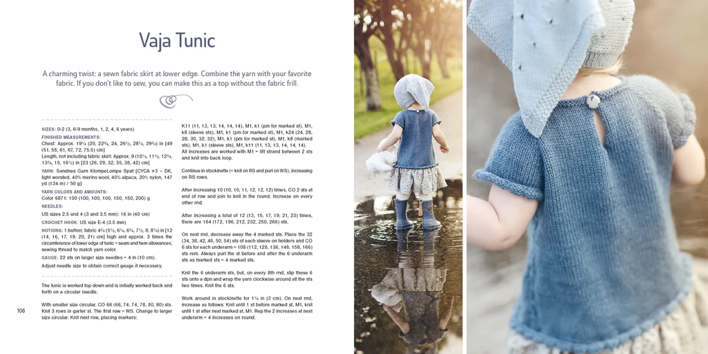 Wonderful creations like these will add Scandinavian magic to your summer: be ready for the party in a sweet Olivia Onesie knitted in a cotton blend yarn. Kangaroo Pants knit up fast on large needles and are equally cute on a newborn or a four-year-old. The David Sweater-Jacket is perfect for summer, and like all the heirloom-quality designs it can be passed down from brother to sister. Billie Shorts are delightful to wear and also to make—garter-stitch shorts, knitted sideways. The Dinosaur Cap or the Blueberry Girl’s Summer Kerchief are perfect to fend off summer breezes. And Lace Tights let you knit up a simple lace pattern plus try a new cast-on method for fine lacy edgings.