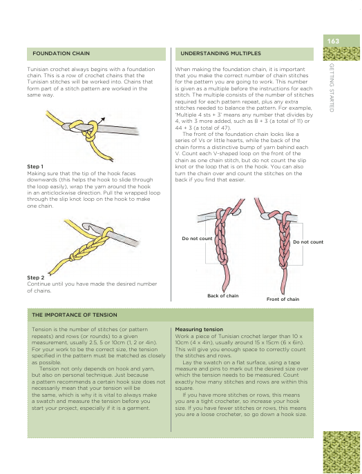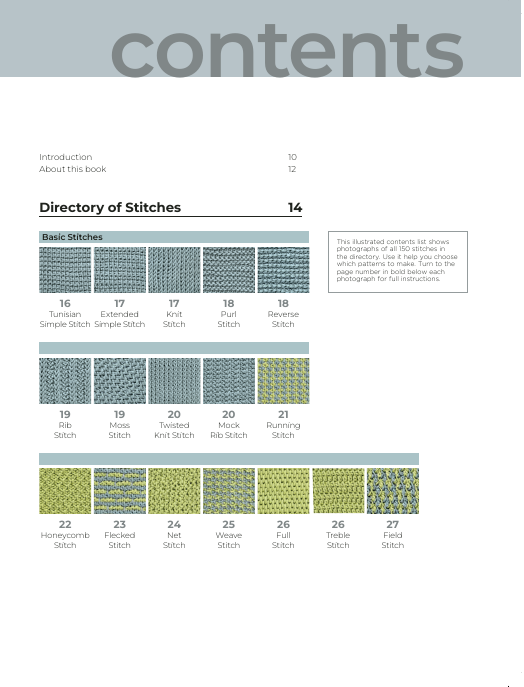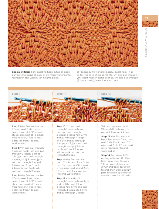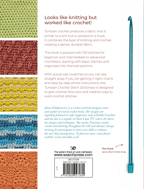 00A directory of 150 Tunisian crochet stitches, featuring step-by-step photographic guides to creating each stitch, with clear written and charted instructions, and accompanied by well-presented swatches.