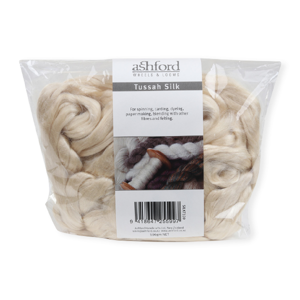 Tussah is naturally soft beige and is from silk worms fed on Oak leaves. It has a very long staple. It is strong, lustrous and more resilient than cultivated “white” silks. Silk is pure luxury. Silk has many qualities. As well as its natural sheen, it is strong, resistant to pilling, and the long fibres make it easy to spin. It dyes beautifully and blends well with other fibres.