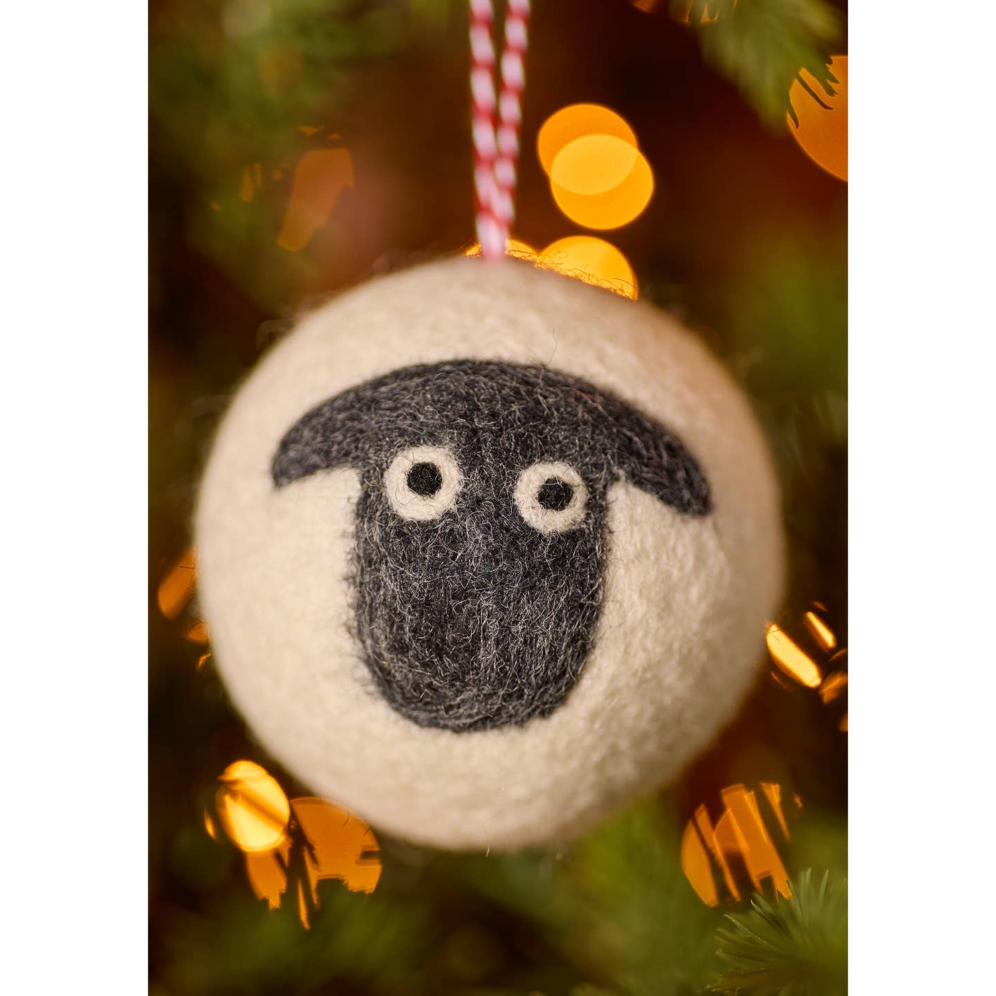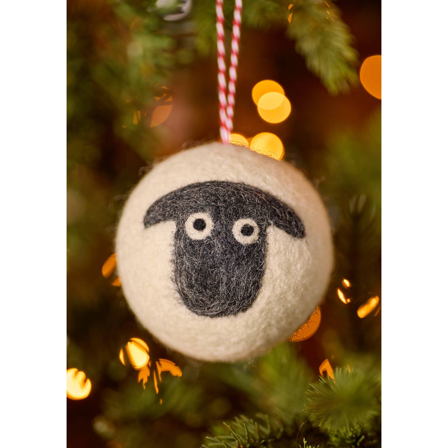A round wool felt bauble decorated with a sheep face and fitted with a red and white hanging thread. From a new range of sustainable eco-friendly Christmas decorations.