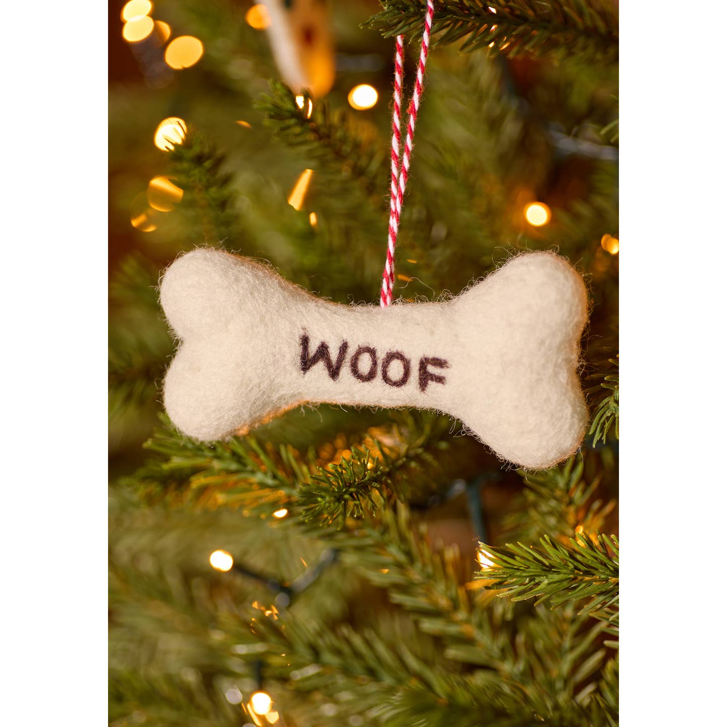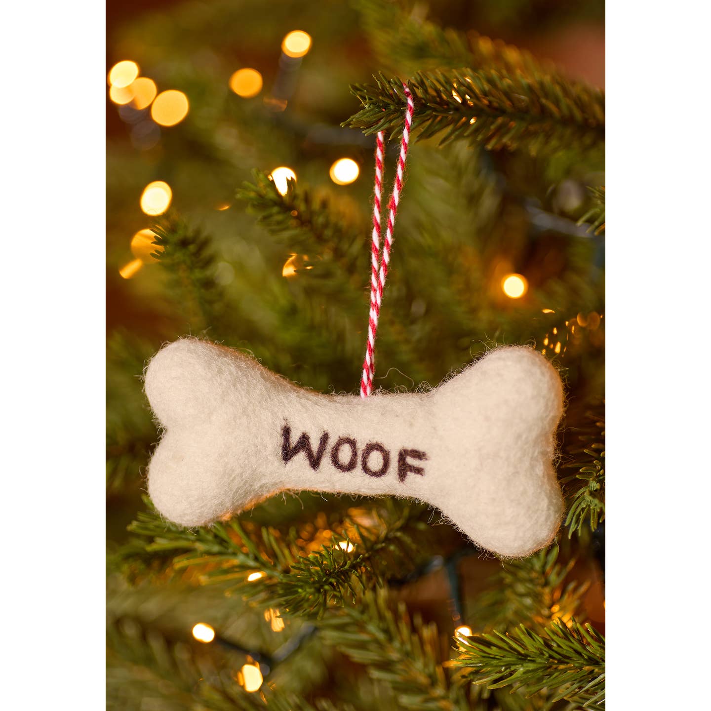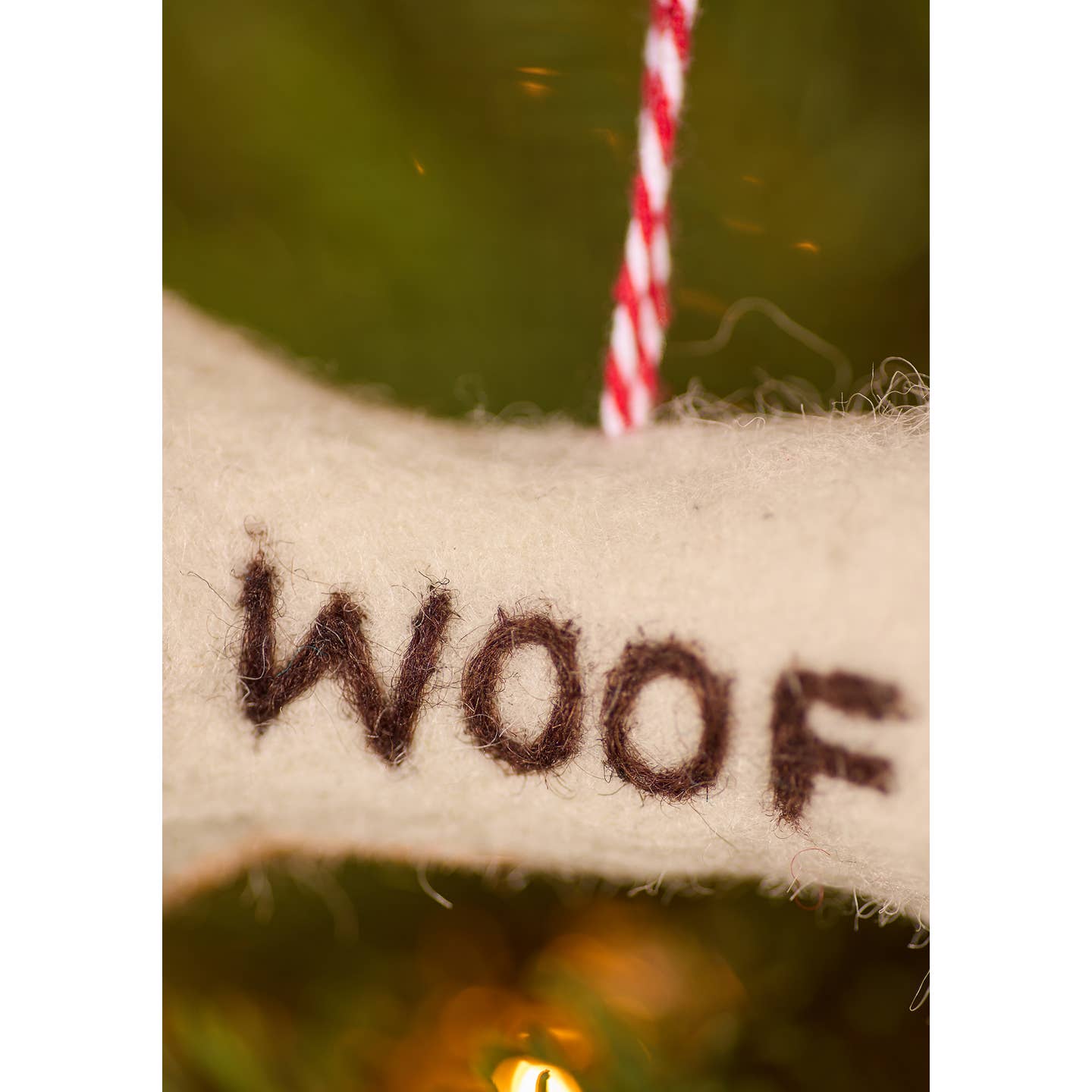 A wool felt bone-shaped hanging decoration with a ‘WOOF’ message. Fitted with a red and white hanging thread. From a new range of sustainable eco-friendly Christmas decoration ideas designed in-house at Nama