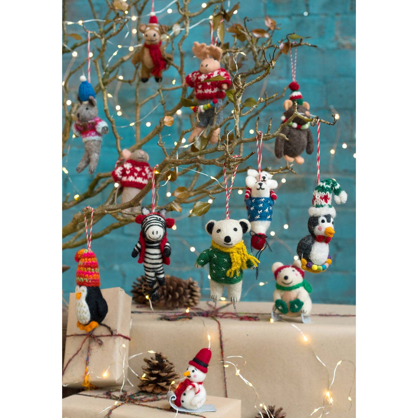 This soft wool-felt zebra has comedy value! Standing cheerfully upright and dressed in red winter warmers, he looks more than ready for the festive season. Fitted with a red and white hanging thread.